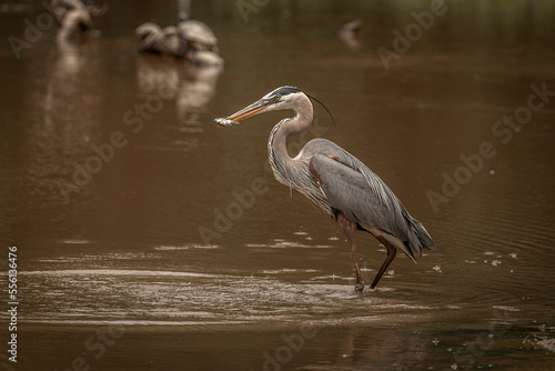 Fototapeta premium Great Blue Heron fishes in the marsh