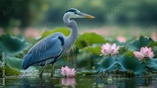 Naklejka premium Great Blue Heron in Water with Lotus Flowers