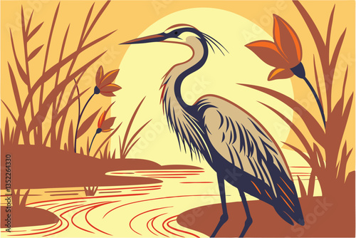 Fototapeta premium 10 Great blue heron, shallow water, golden sunset light, ripples, colorful bokeh background, vibrant orange flowers, sharp focus, wildlife photography, detailed feathers, serene atmosphere, nature por
