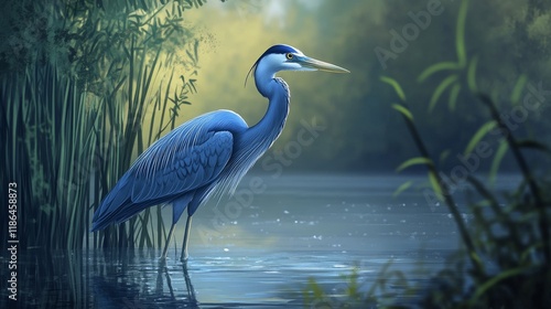 © Digital Dreamscapes, Fototapeta premium Great Blue Heron Standing Serene in Calm Water Surrounded by Reeds