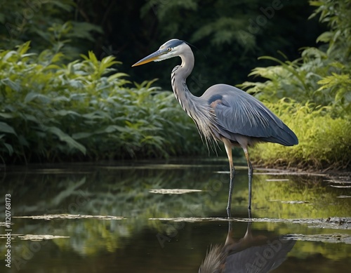 © Rini, Naklejka premium Great blue heron wading in shallow water, reflected in calm water, surrounded by lush green vegetation.