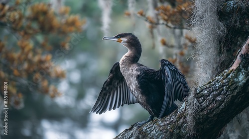 © Amelia, Naklejka premium Great blue heron with grey and blue feathers standing in a forest setting near water, capturing its wildlife nature and long beak