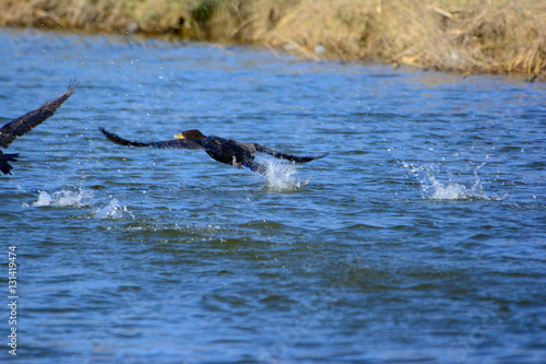 © jwjarrett, Fototapeta premium Great Cormorant (Phalacrocorax carbo) taking flight. water splashing