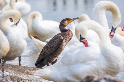 Obraz premium Great cormorant stands among white swans on the lake shore