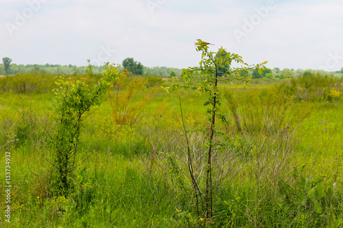 © olyasolodenko, Fototapeta premium Great crested flycatcher on young tree