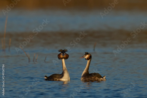 Obraz premium Great Crested Grebe (Podiceps cristatus) courtship dance with weed on a lake...
