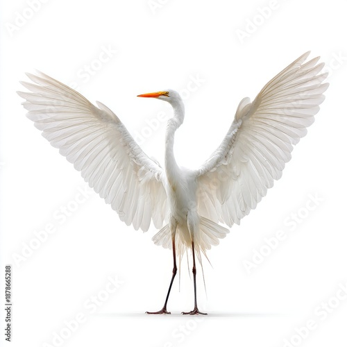 © Yothin, Fototapeta premium Great Egret Standing White Background Wings Spread Open Detailed Feathers Bright Orange Beak