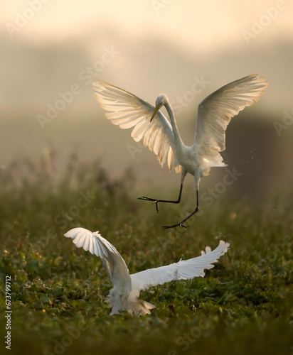 © tahir, Obraz premium Great egrets Fight in Wetland in morning