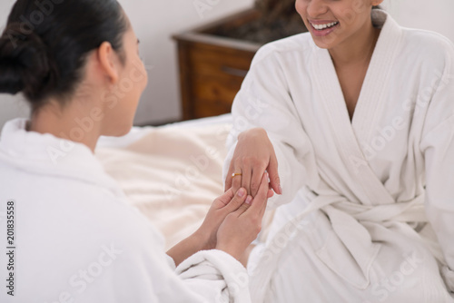 © zinkevych, Obraz premium Great event. Pleasant young woman holding her friends hands while looking at her engagement ring
