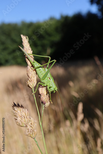 © Andrea, Naklejka premium Great Green Bush-Cricket Climbing on Wild Grass in Summer Meadow