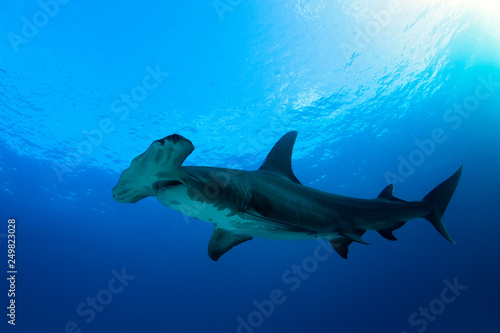 Obraz premium Great Hammerhead Shark (Sphyrna mokarran) against Blue Water and Surface....