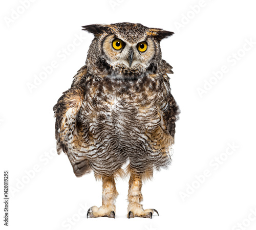 Fototapeta premium Great horned owl, Bubo virginianus saturatus, or tiger owl, ruffling feathers looking impressive, isolated on white