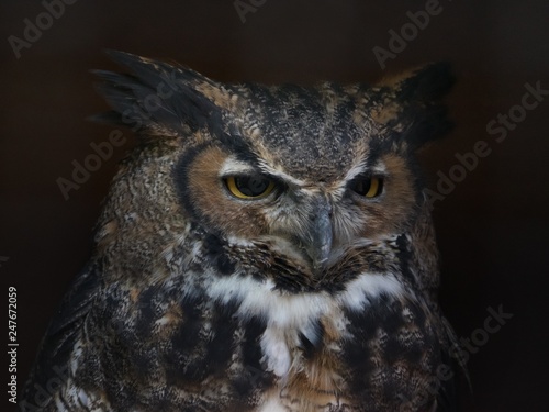 © Jean Landry, Fototapeta premium Great Horned Owl closeup portrait against black background