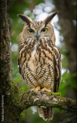 © gassh, Obraz premium Great horned owl on a branch wildlife nature concept