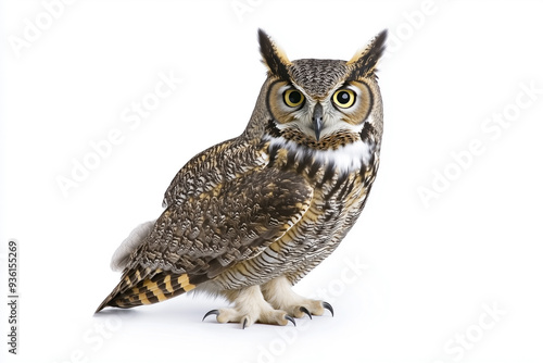 © kossovskiy, Fototapeta premium Great horned owl on a perch, isolated against a white backdrop