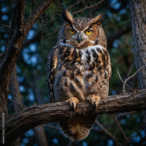 Obraz premium great horned owl on branch.A majestic owl perched on a branch with a dark,...