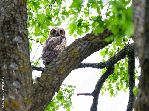 © FotoRequest, Obraz premium Great Horned Owl Owlet sitting on tree branch on blue sky, portrait