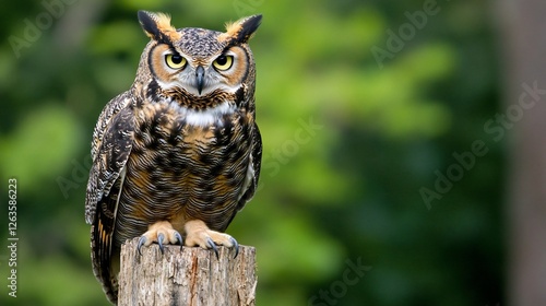 © adspttra, Obraz premium Great Horned Owl perched, forest background, wildlife photography