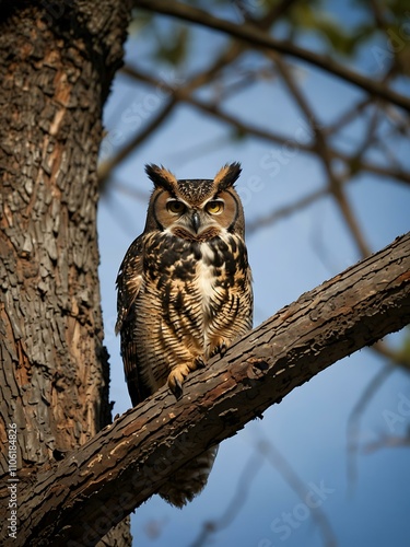 © claudunia, Obraz premium Great horned owl perched in a tree.