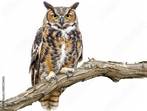 © Yuriani, Naklejka premium Great Horned Owl Perched on a Branch Isolated On White Background