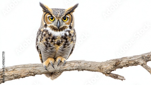 Obraz premium great horned owl sits gracefully on a branch, its vibrant yellow eyes...