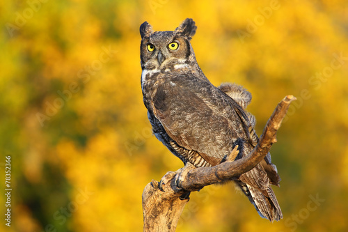© donyanedomam, Naklejka premium Great horned owl sitting on a stick