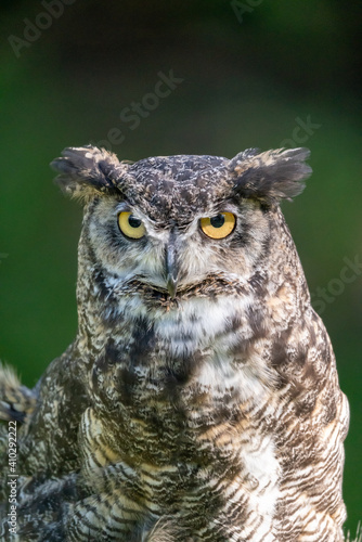 © kcapaldo, Fototapeta premium Great horned owl sitting on log in Montana