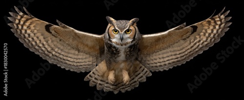 © ckybe, Fototapeta premium Great horned owl soaring with wings wide open in the air.