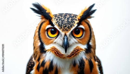 Obraz premium Great horned owl stares intensely forward. Detailed close-up shows vibrant orange eyes, sharp beak, and intricate feather patterns. This wild bird of prey is majestic and wise.