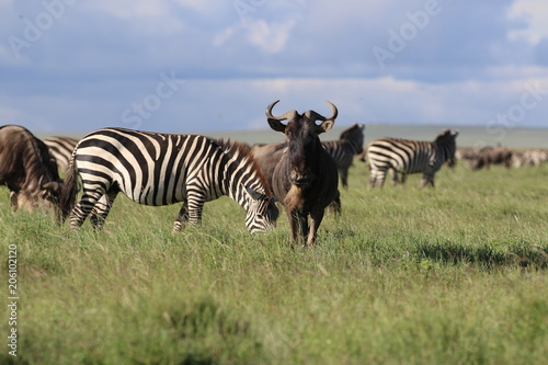 Naklejka premium Great migration Serengeti, Zebras and Wildebeest. Tanzania, Africa