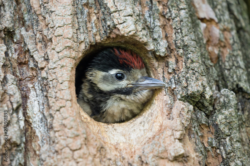 © Manuel, Obraz premium Great spotted woodpecker chick in nest (Dendrocopos major)