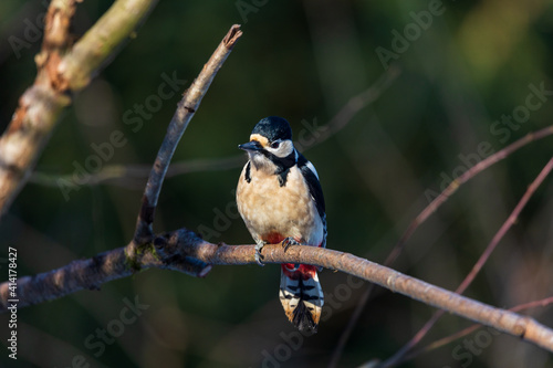 Naklejka premium Great Spotted Woodpecker in winter sunlight
