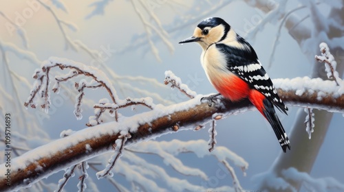 Naklejka premium Great Spotted Woodpecker on a snowy branch, with the bird’s bright red and...