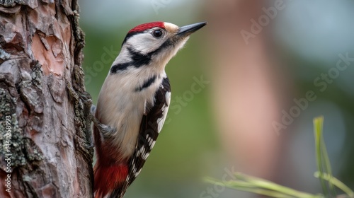 Obraz premium Great Spotted Woodpecker on Pine Tree