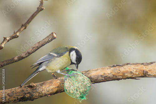 Fototapeta premium great tit, blue tit eats fat ball at the manger in the branches of trees