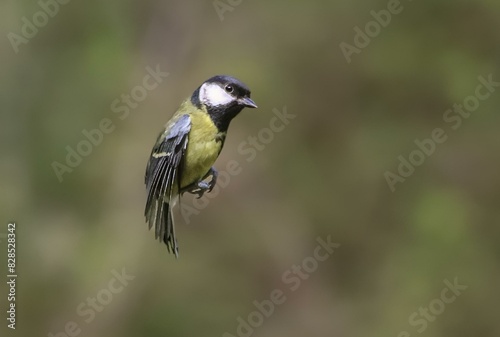 © Wirestock, Fototapeta premium Great tit flying by grass and trees