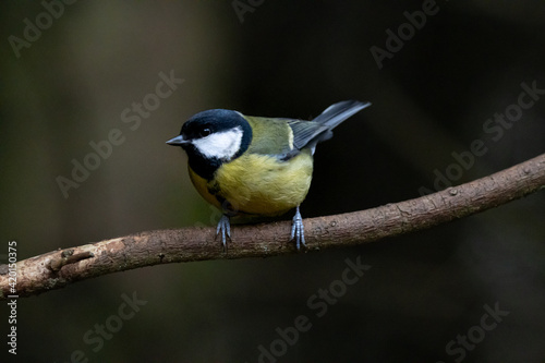 © M Temes, Fototapeta premium Great tit on a branch, dark background