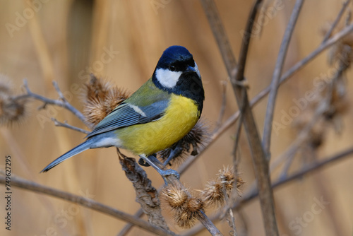 © ZenAga, Fototapeta premium Great Tit on a dry wildflower