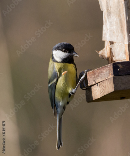 © madame_fayn, Naklejka premium Great tit on feeder with seed falling