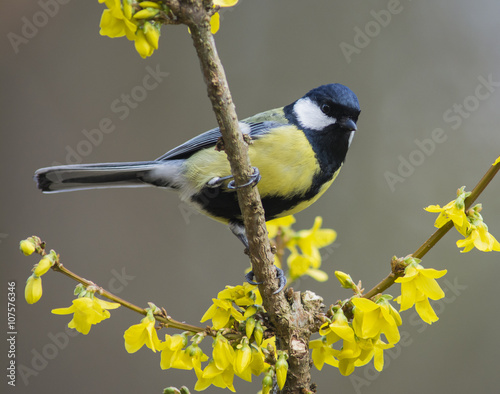 © Bruno T, Fototapeta premium Great Tit on forsythia in sprintime