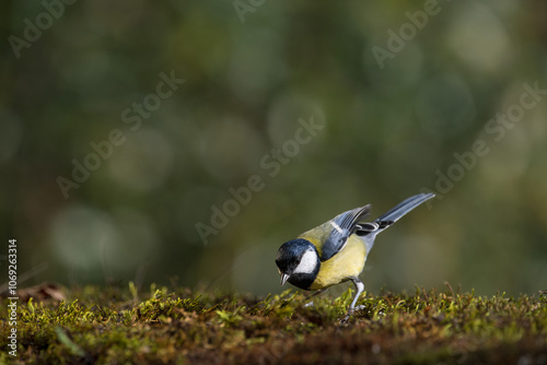 © Marc Andreu, Obraz premium Great tit on the mossy ground. Soft evening light and blur background with shallow depth of field.