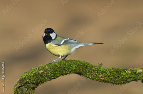 Naklejka premium Great tit (Parus major) bird standing on a sprig covered of green moss
