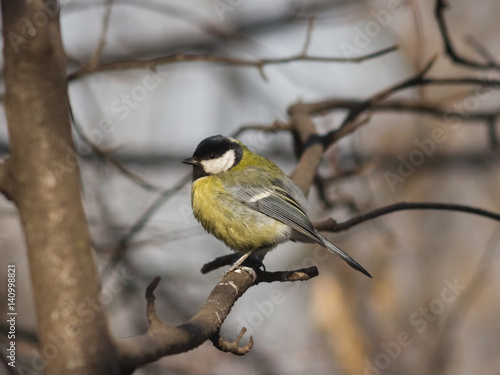 Naklejka premium Great tit, Parus Major, close-up portrait on branch with bokeh background, selective focus, shallow DOF