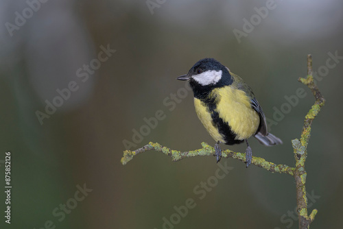 Obraz premium Great tit, parus major, perched on a small branch in a park in Algorta, Bizkaia