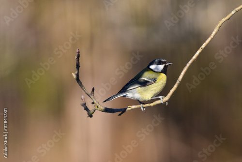 © DesignToonsy, Obraz premium Great Tit, Parus Major Perched on a Tree Branch, Warm Blurred Background. Romania Wildlife in Natural Habitat.