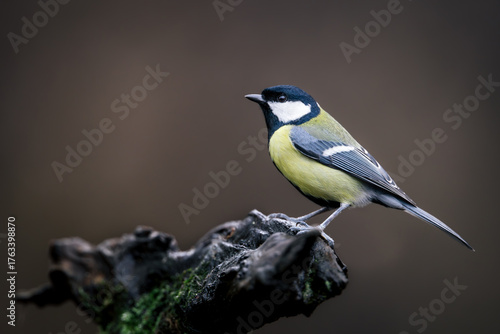 © Branislav, Naklejka premium Great tit (Parus major) perched on mossy branch, side view against brown blurred background. Vibrant yellow, black, and white plumage, classic songbird in natural woodland setting, detailed wildlife p