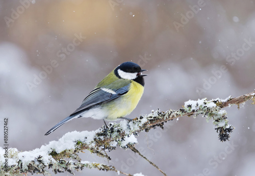 © Henri, Fototapeta premium Great tit (Parus major) sitting on a branch and singing in snowfall in the garden in spring.
