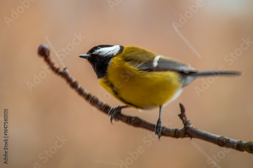 © IrynaLinnyk, Obraz premium Great tit (Parus major) tilting head on a branch in winter