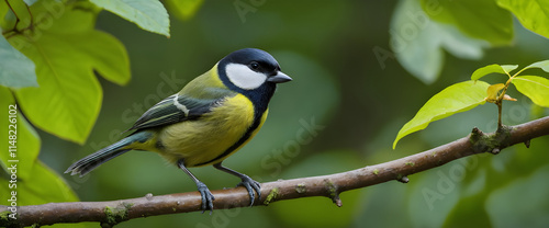 Obraz premium Great Tit Perched Gracefully on a Leafy Branch in Natural Surroundings.