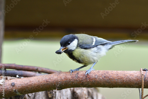 © Pavol Klimek, Obraz premium Great Tit with sunflower in beak sitting on a branch in the garden